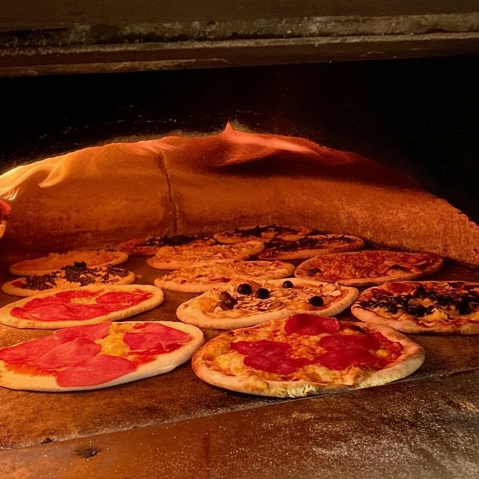 In unserem Steinofen backen wir mehrere Pizzen gleichzeitig – mit knusprigem Rand und ordentlich Belag für jeden Geschmack. Wenn der Ofen voll ist, sind wir in unserem Element und sorgen für Pizza nonstop.